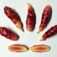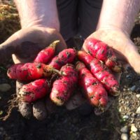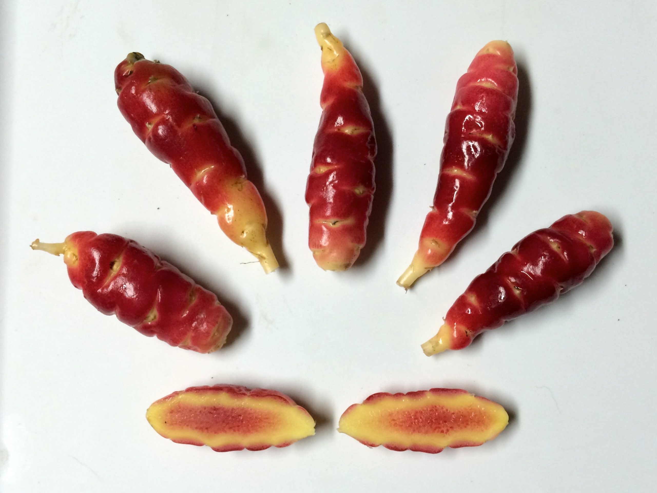 Sockeye is a moderately tart variety, with what we might call the classic oca flavor, something like a potato with lemon or sour cream. Raw, it has attractive, shiny, red skin and light yellow flesh with a red core. It can be sliced thinly for raw dishes, which will produce disks with contrasting red and yellow rings. Cooked, the texture is very soft and the tuber will disintegrate with long cooking time. Like most oca varieties, Sockeye loses most of its color when cooked, usually becoming light pink.