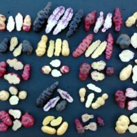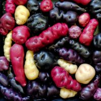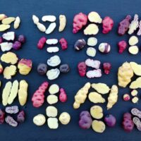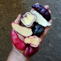 Ayock TPS has so far produced mostly fingerling shapes, with moderately deep eyes, in a fairly even mix of reds, blues, whites, and yellows. There is a lot of deep blue/black color, which is hard to find. Flavor has been uniformly good, with no bitter tubers. Texture is more to the waxy side of the spectrum. The majority of the plants produced tubers under long summer days, but a few plants produced no tubers and are probably short day. A picture of some of the progeny is included in the gallery above.
