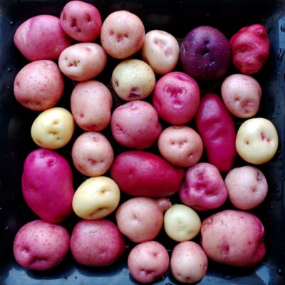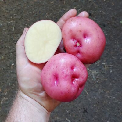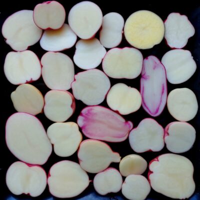 TPS was produced in 2020 and was open pollinated, although I also hit it with bulk tetraploid pollen several times throughout the season. I expect the majority of the progeny to be similar to the parent, reds with white flesh and later maturities. Because it was outcrossed, there should also be some progeny of other colors. Somewhat slow germination, probably indicating that this seed has some dormancy.