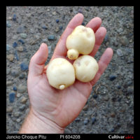 Jancko Choque Pitu plants are large and vigorous. The tubers are formed in the short days of fall, so this variety is best harvested no earlier than November. At that point, yields are typically in the range of one to two pounds. Plants survive light frosts and overnight temperatures into the upper 20s. Tubers have very long dormancy, The plants flower heavily and set plenty of berries but the seed count in those berries is generally low.
