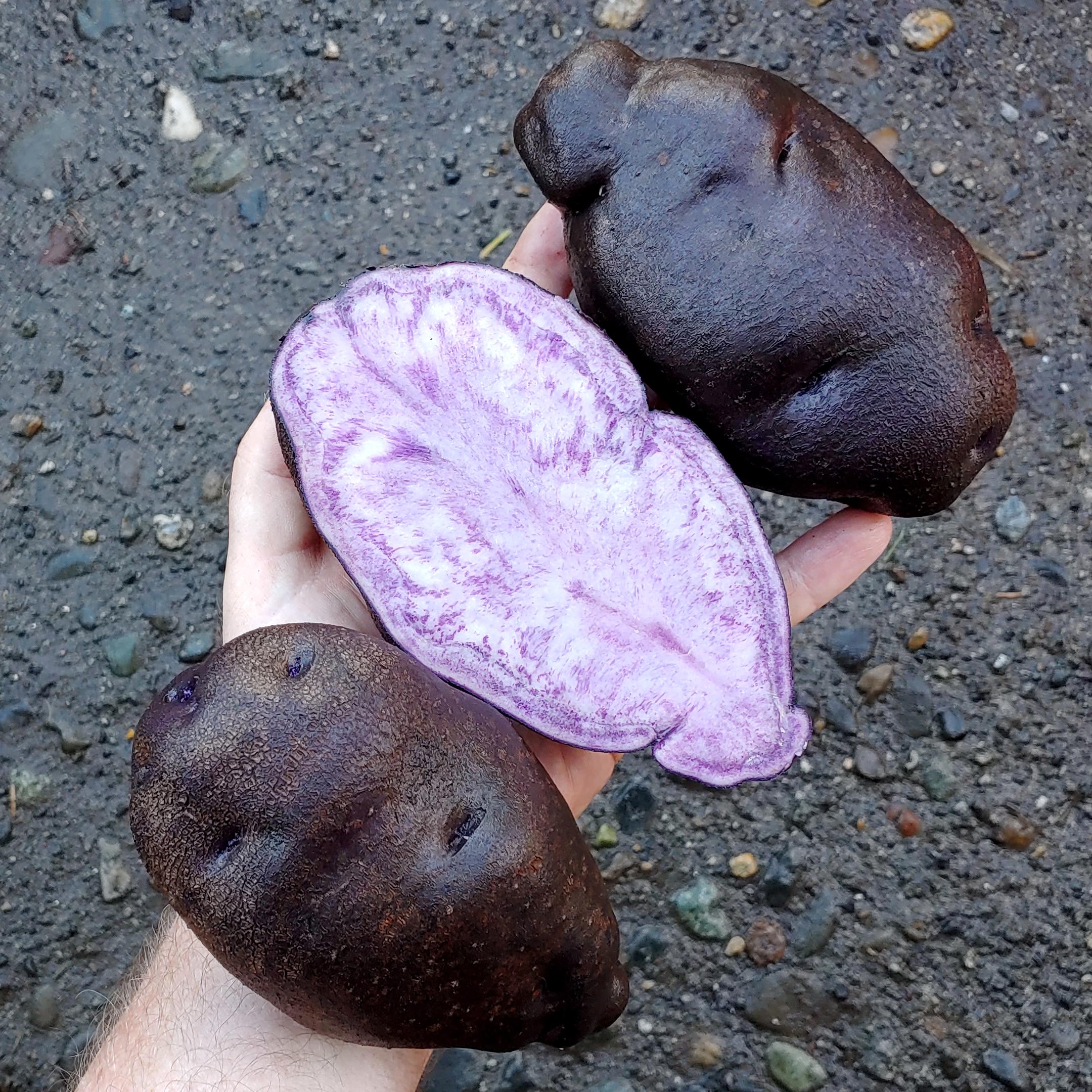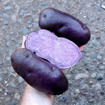 Gunter Blue is a Cultivariable original variety, selected in 2019. It is a medium to large tetraploid with blue skin and flesh and very high yields. The female parent was Gunter Gold, a selection made from the Pacific Northwest heirloom variety Johnny Gunter, and the intended male parent was a selection out of Careta Amarilla, a Colombian diploid potato with intense yellow flesh. I suspect that cross didn’t actually take and that this caught some stray pollen from another variety, since a blue doesn’t make sense out of that cross. Oh well, it was a happy accident!