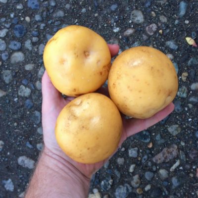 Skagit Valley Gold has poor scab resistance and is likely to suffer from scab in dry conditions or in soils with high concentrations of scab bacteria. Maintaining a consistent, moderate level of soil moisture will minimize scabby tubers. It also appears to be susceptible to internal rust spot, a physiological condition that can occur in calcium poor soils. I have often observed this in our severely depleted soil. You can manage that by amending with bioavailable calcium in areas with low soil pH. It appears to have some resistance to early blight, insofar as we usually see early blight on the plants in the spring, but they typically recover as the weather dries out. Skagit Valley Gold appears to have moderate resistance to late blight, showing few lesions per plant and slow progression even when bordering more heavily infected varieties.