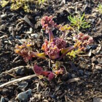 Yaquina Head is a lighthouse sea kale. Sea kale has naturalized at a few beaches along the west coast of the USA, mostly near lighthouses. Preeminant edimentalist Stephen Barstow suggested that sea kale is probably found near lighthouses because they often had gardens in their early years, before the communities around them were well established, and sea kale was well suited to growing in seaside conditions. These populations most likely escaped their gardens in the late 1800s and early 1900s. This variety was established from a cutting taken from a plant growing near the base of the stairs at Yaquina Head, near Newport, Oregon. The light at Yaquina Head was opened in 1873. Sea kale was first reported to grow in that spot in 1915 and I collected a sample a century later in 2015. Thank goodness no one has yet identified it as a foreign invader and tried to eradicate it. Yaquina Head has green stems with a definite blue cast to the leaves. Early growth, which is always the most distinctive phase, is purple with green tips. The plants are large and sprawling when established.