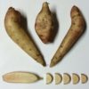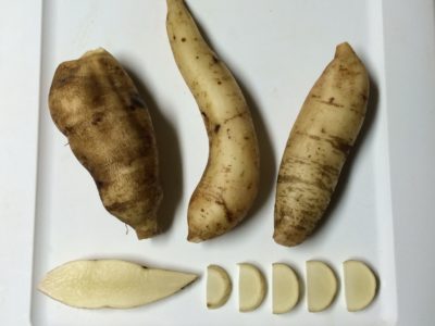 Bekya is said to be a Korean commercial variety (although it almost certainly originated in the Andes). Plants are medium height (about five feet here), stems are green mottled with purple, and tubers are tan with white flesh. It is high yielding and appears to be more resistant to cracking in wet soil than other varieties. Bekya is the least sweet of the varieties that we grow, although it becomes sweeter in the weeks following harvest. This variety might be more interesting for use as a cooked vegetable than for fresh eating. This variety has moderate dormancy; rhizome will keep for 2-3 months at 38 F before sprouting significantly.