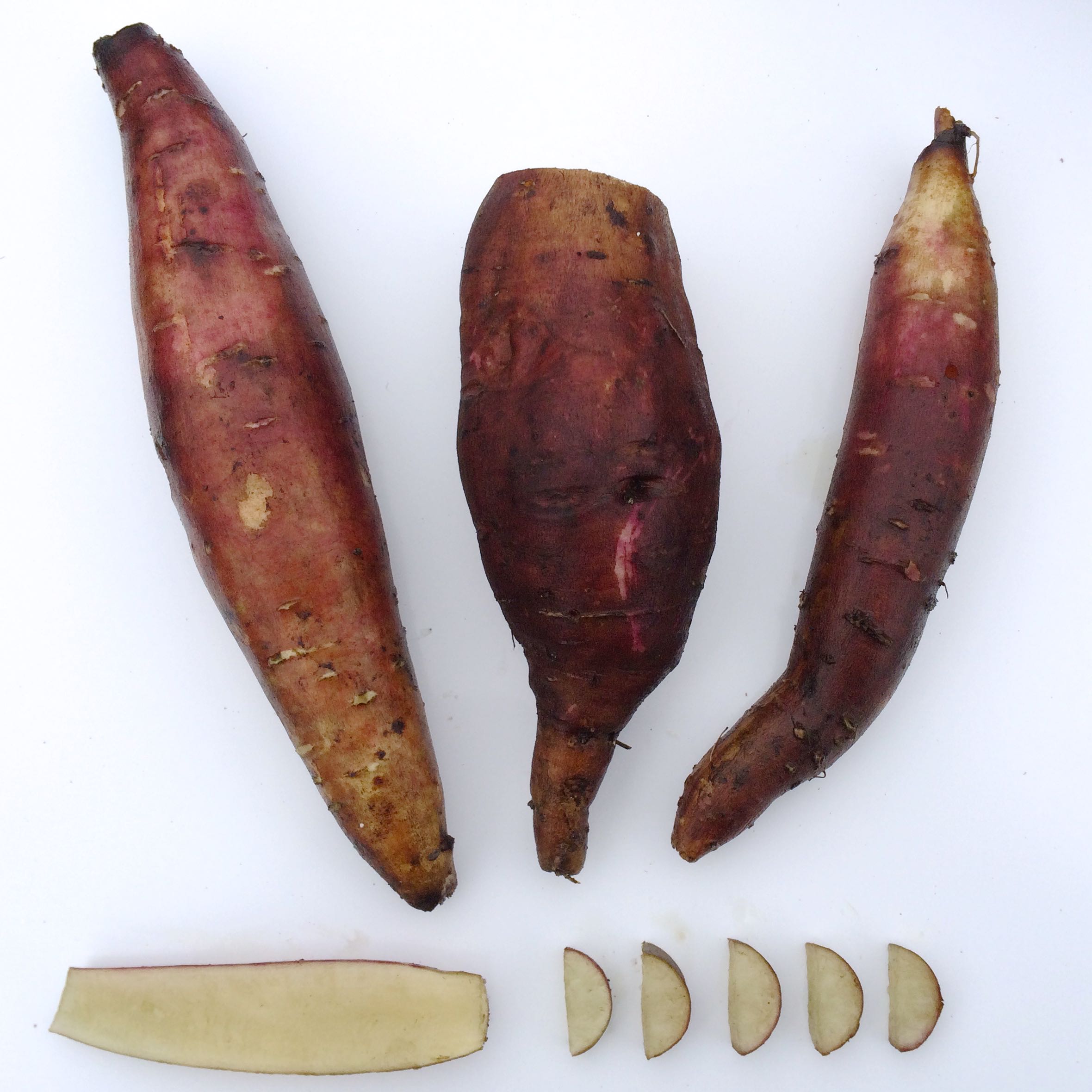 Cajamarca is a Peruvian variety. Tan tubers streaked with red/purple, becoming much redder after exposure. The tubers are some of the largest that we see and they are fairly sweet even at harvest. In my opinion, this is the most attractive of any of the heirloom yacons and a good choice for an edible ornamental. Cajamarca has the largest leaves of any of the varieties that we grow and the foliage fills out more than the other varieties. A bit later maturing than most varieties, so probably not the best choice for short season climates. Medium height, reaching about six feet here, although it can grow taller with a long enough growing season.