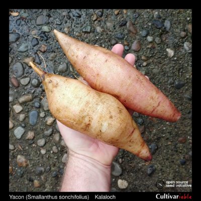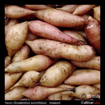 Seeds are open pollinated. Because yacon is a polyploid hybrid, the seeds will not grow true to type. They are suitable for use in breeding or conservation efforts and could be used to select varieties similar to the parent type.