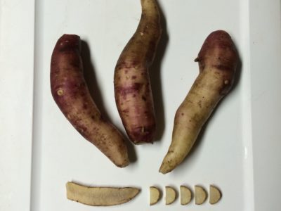 This is reportedly a New Zealand commercial variety and probably originally of Ecuadorian origin. This is a great all-around variety that would be my second choice after Cajamarca. Plants are high yielding producers of white/tan tubers with a lot of purple/red blushing, becoming darker after exposure. Unlike many varieties, this one continues growing taller after flowering begins and often ends the season more than seven feet tall here. Rhizome dormancy is among the longest at 38 F, lasting 3-4 months without significant sprouting.