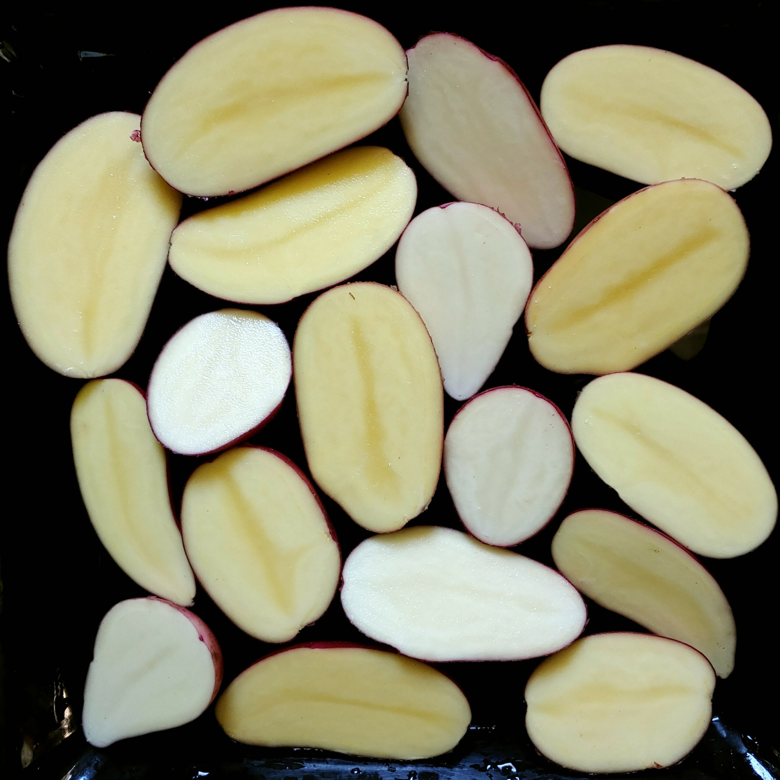 Not much information is provided in the seed catalog descriptions.  What guidance that is provided is the usual catalog fare, which is to say, broadly worded.  It looks like we can expect mostly red skin, white flesh types with mid-season maturities, with a flavor “somewhere between a yellow skinned type and a russet,” producing 4 to 5 tubers with a yield up to 20 ounces.  As you can see from the pictures, that is not too far off the mark, although the tuber count that I obtained was much higher.