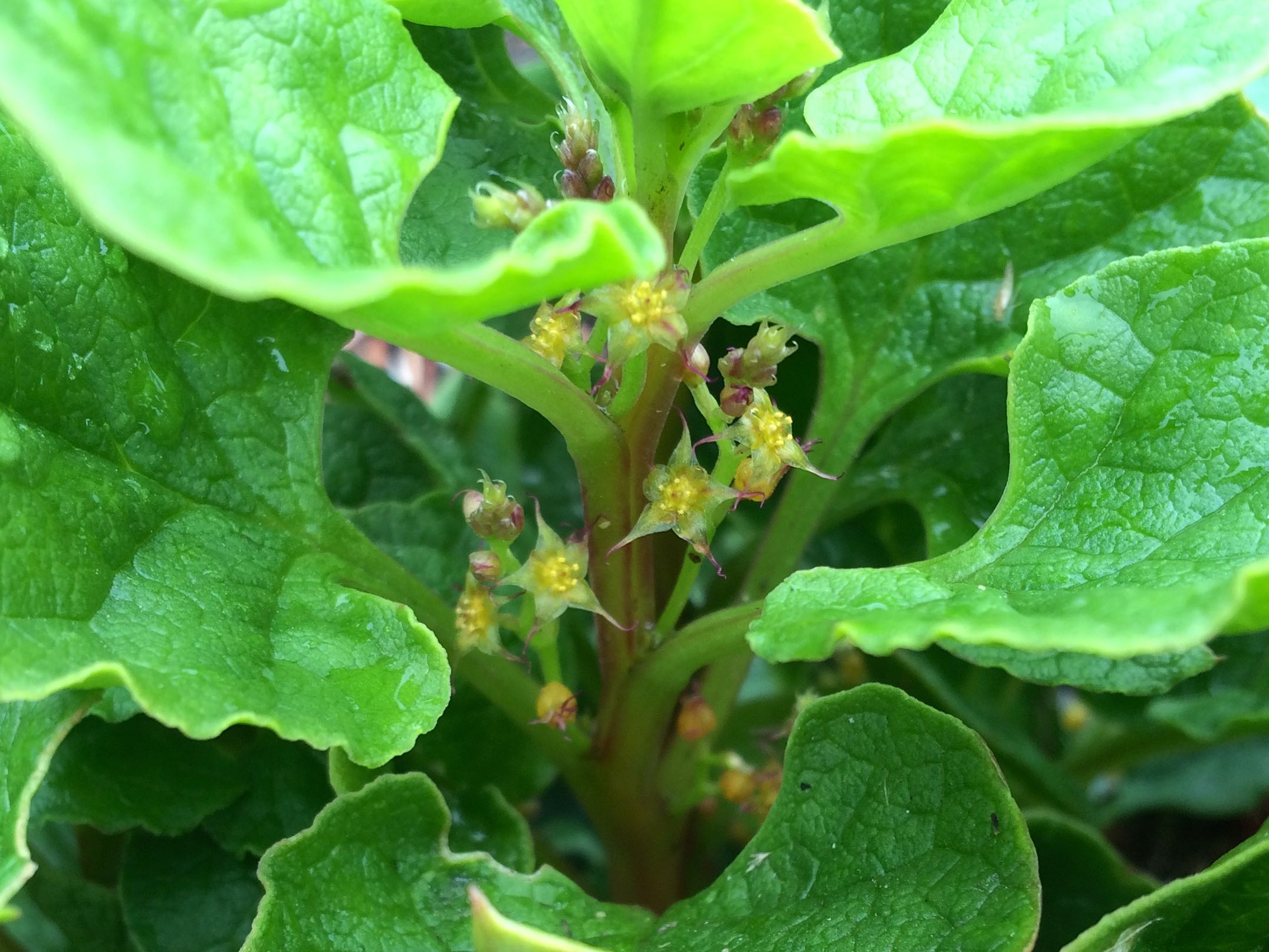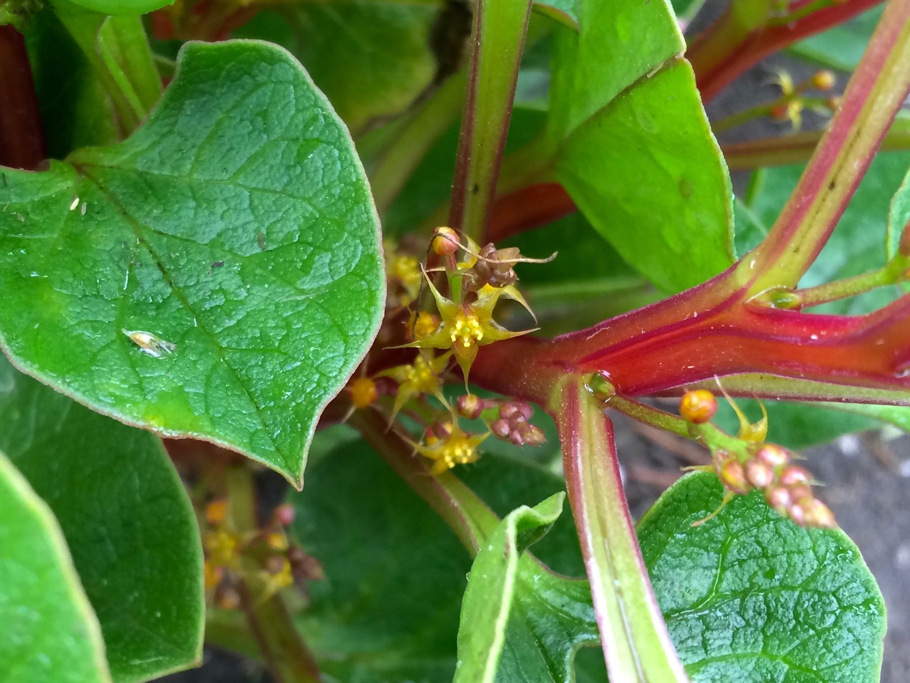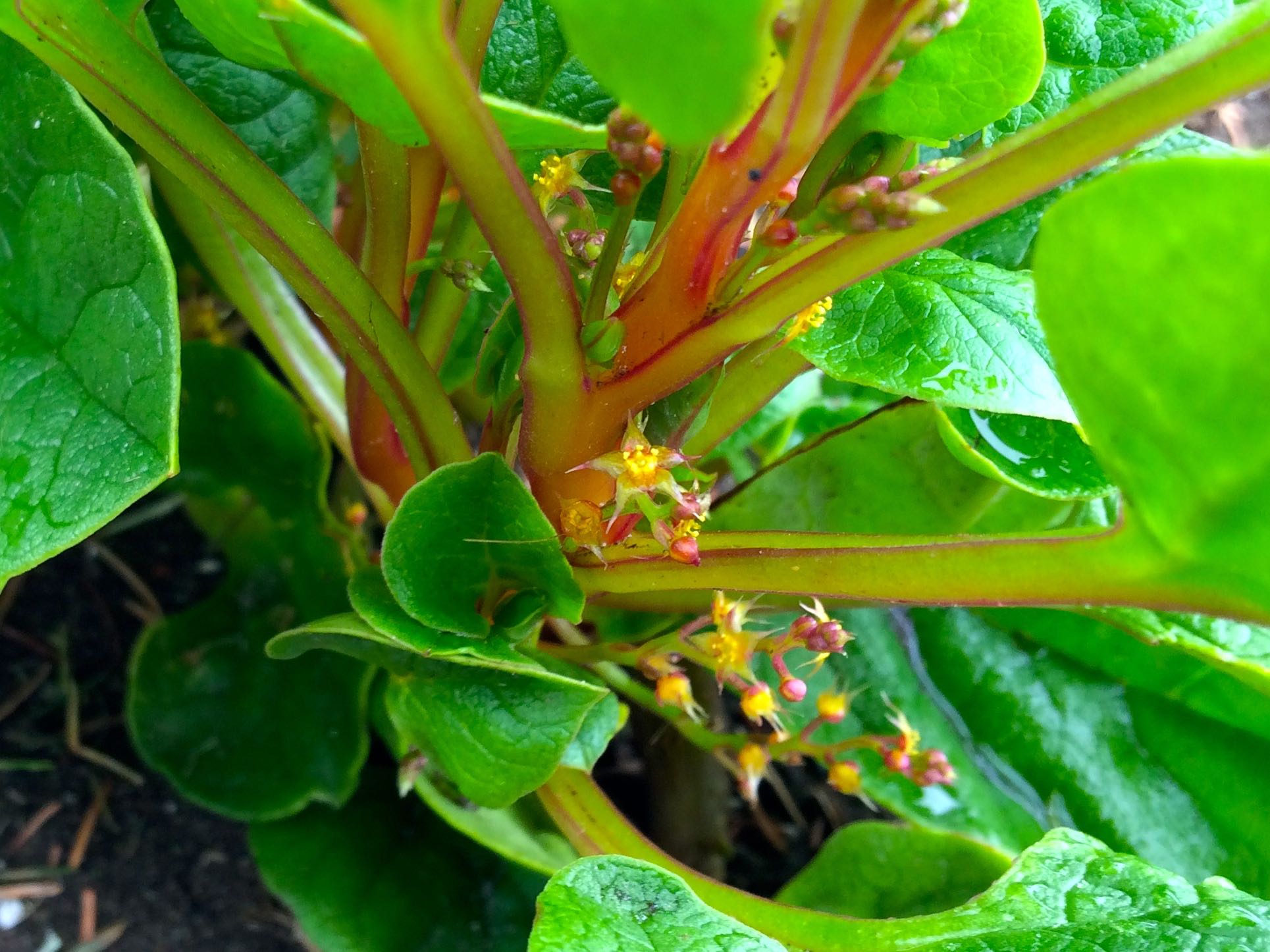This is the first ulluco seedling, born on February 6th. We have three plants of this variety, from cuttings that I took early on. I scared myself when the wound from one of the cuttings got moldy and didn’t take any more, so this is the only plant that I have propagated. I’m just going to be patient with the rest. It is hard to tell since ulluco hides its flowers, but this is an extremely floriferous variety. There are hundreds of flowers on this plant.