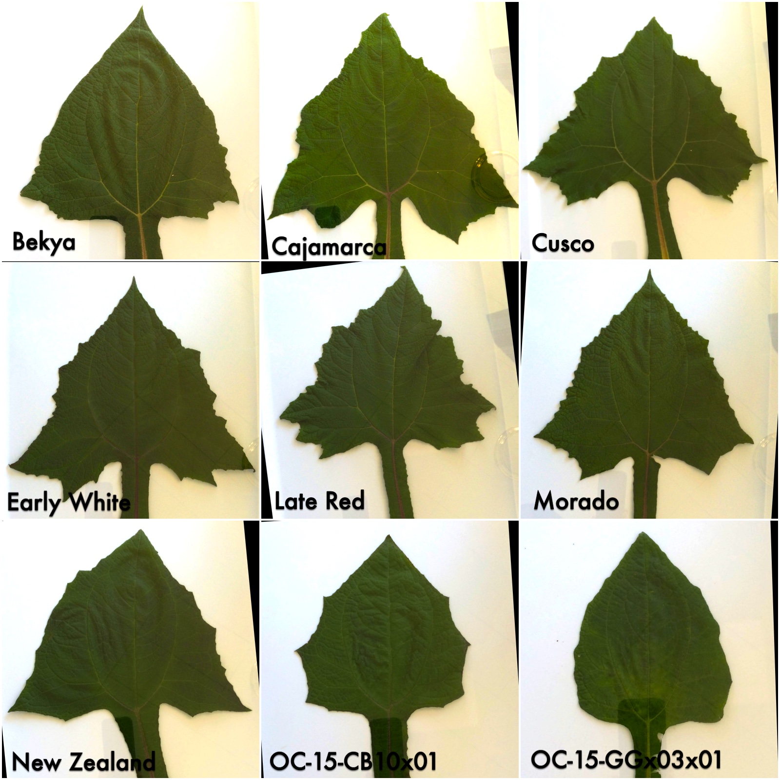 You can see from this picture that there are a few features of the leaf that can be very useful in distinguishing varieties. The degree of serration runs from almost nothing (OC-15-GGx03x01) to rather severe (Late Red). The shape of the base also runs quite a range, from the almost completely oblique (OC-15-CB10x01 and OC-15-GGx03x01) to the clearly hastate (Early White and Cajamarca).