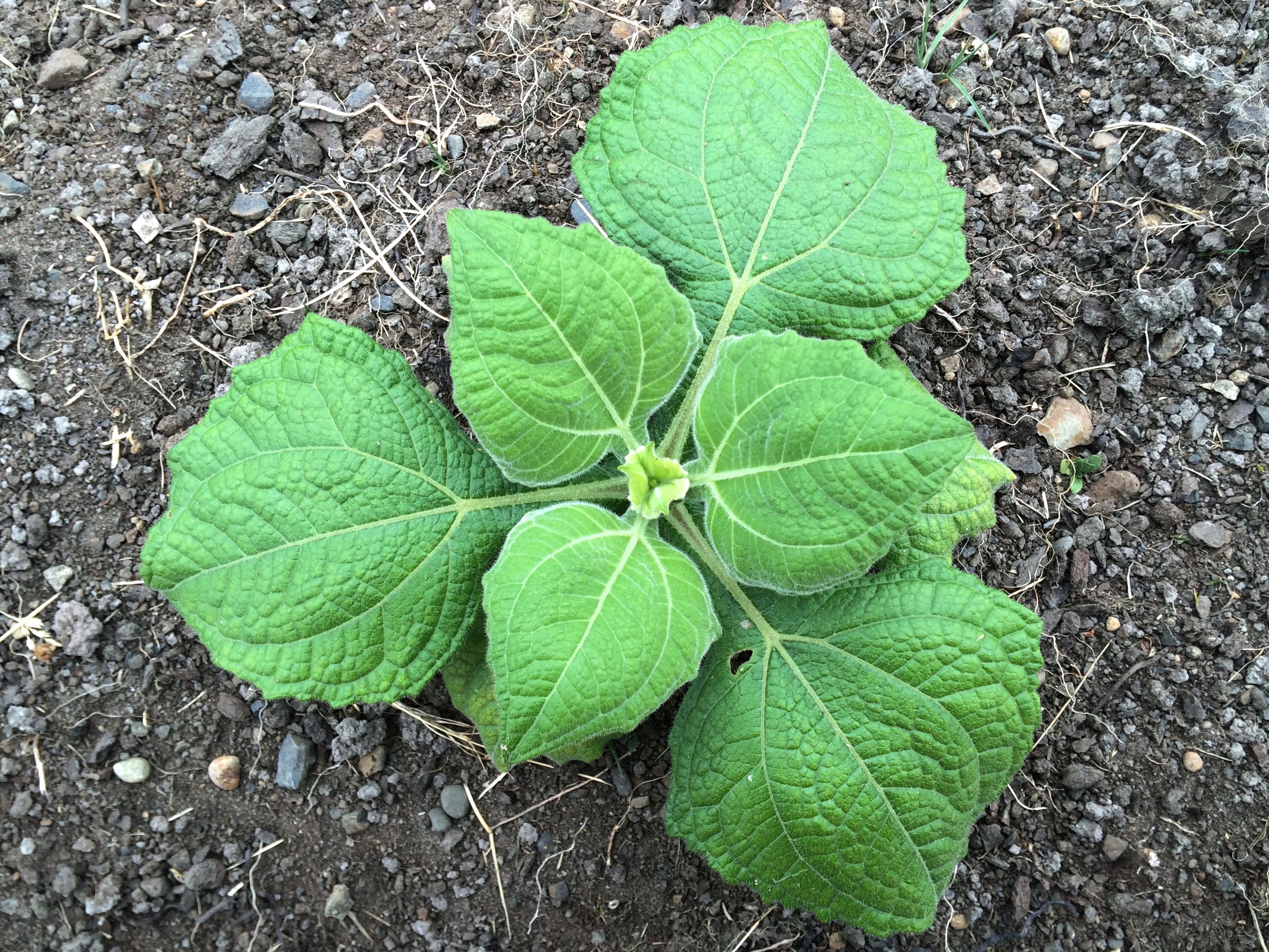 Normally, yacon leaves are arranged opposite and decussate; they are found in pairs on opposite sides of the stem and the each pair is offset 90 degrees, such that two pairs of leaves form an X. Here, the leaves are whorled and offset at 60 degrees.